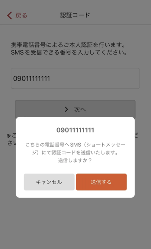 ご登録いただいたメールアドレス宛に、「メンバーズカードNo.」と「認証コード」が届きます。認証コードをご入力いただき、送信をタップ。